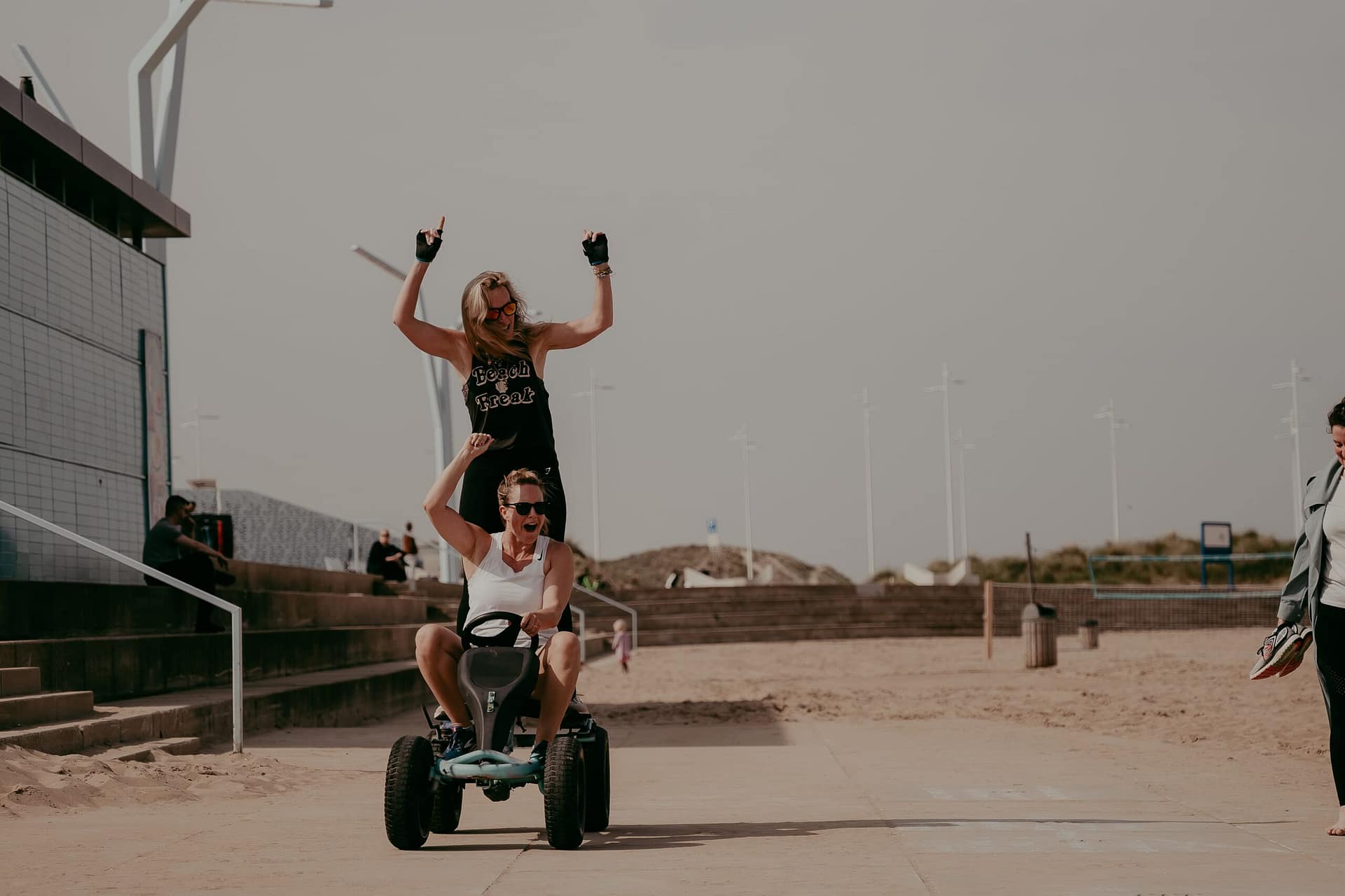 Op de boulevard of in het zand, met het geluid van de golven op de achtergrond, doen we eenvoudige oefeningen die goed zijn voor balans, souplesse en kracht. Geen topsport, wél in beweging blijven.